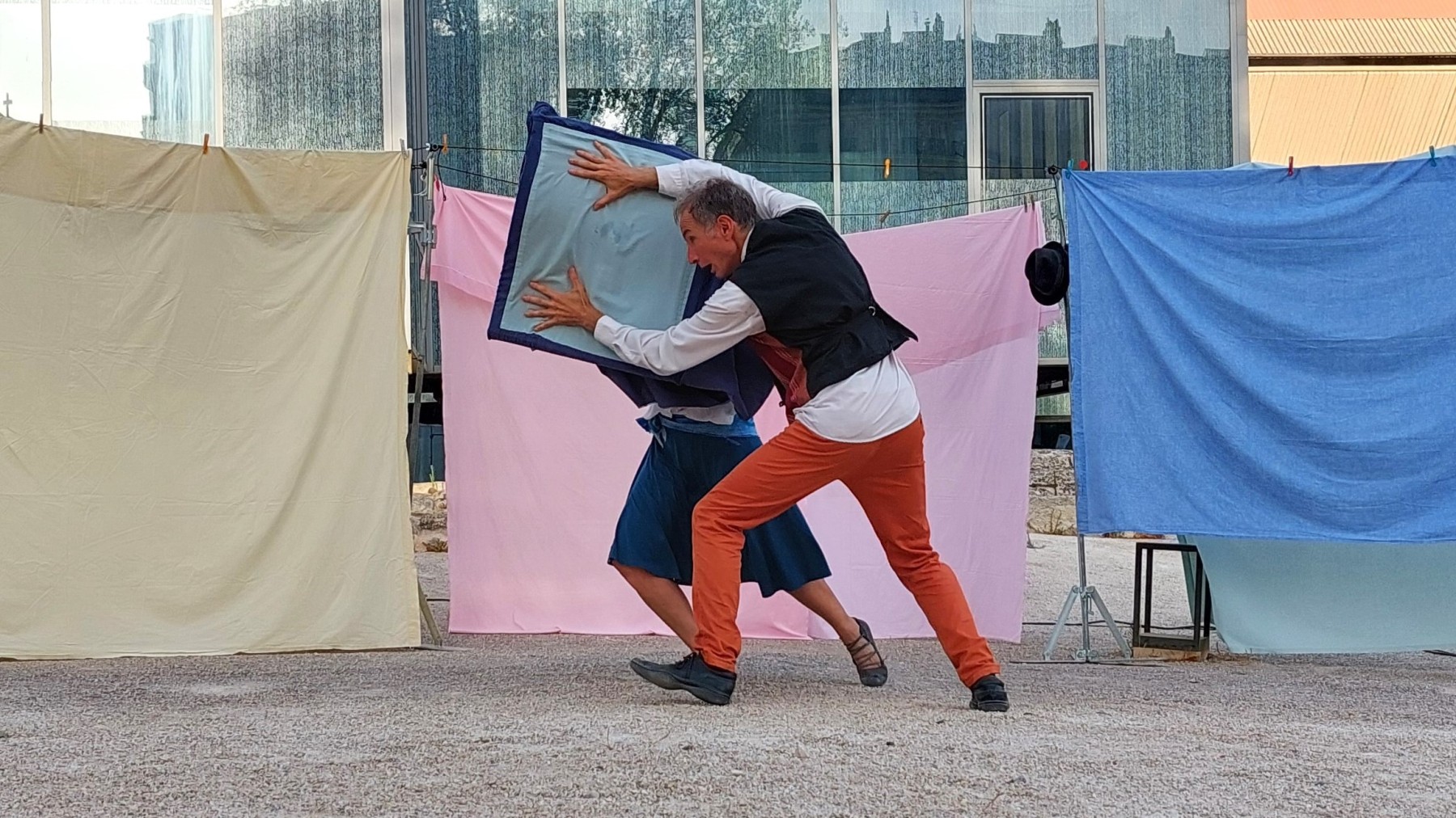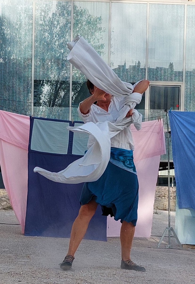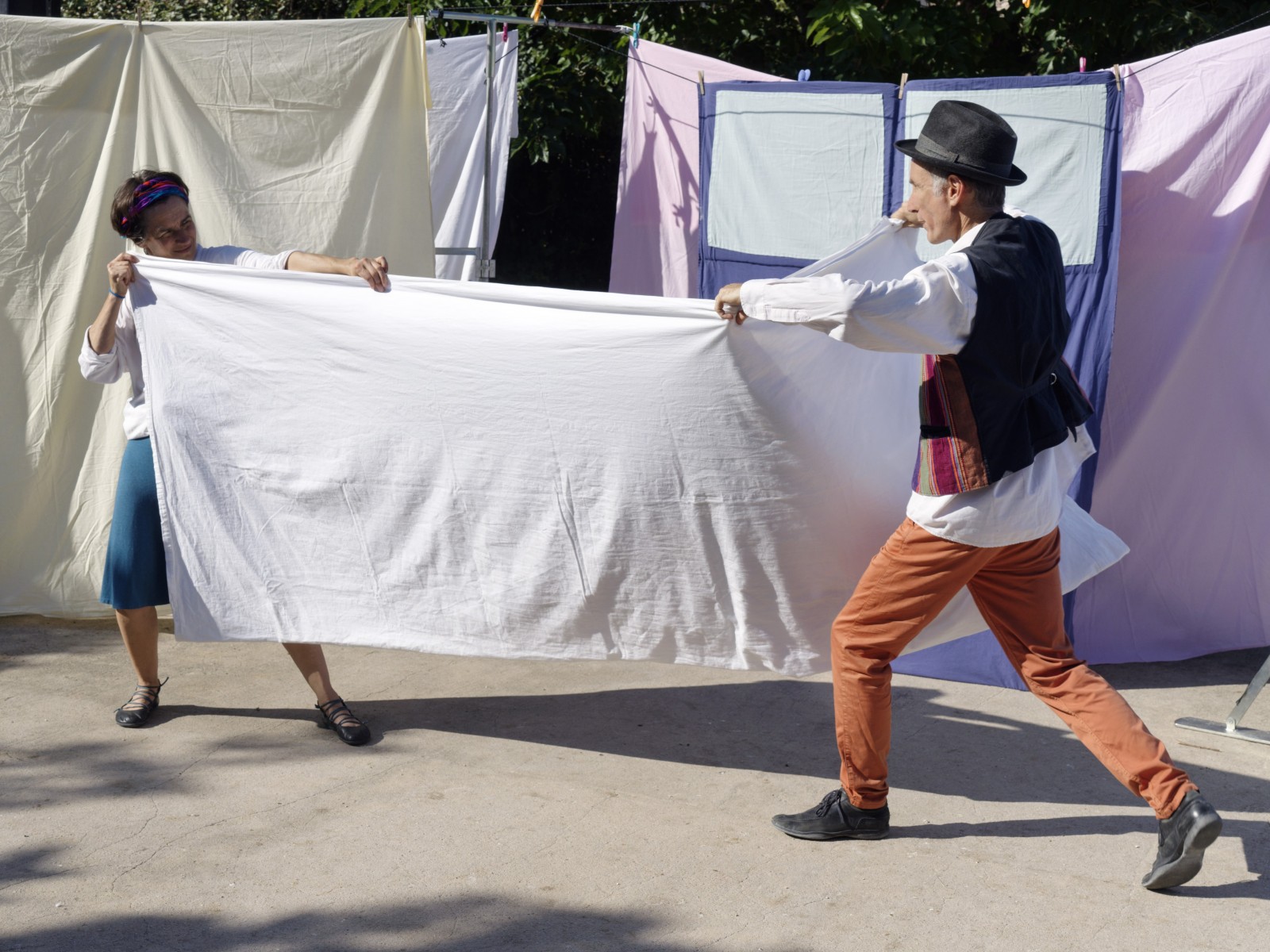 Quoi de mieux que le drap conjugal pour évoquer la vie de couple ! Le drap que l’on tire à soi dans le sommeil en découvrant l’autre, le drap que l’on plie à deux dans les tâches ménagères. Ainsi ce spectacle s’articule sur un action récurrente, le pliage, scène répétée et qui n’aboutit apparemment jamais.