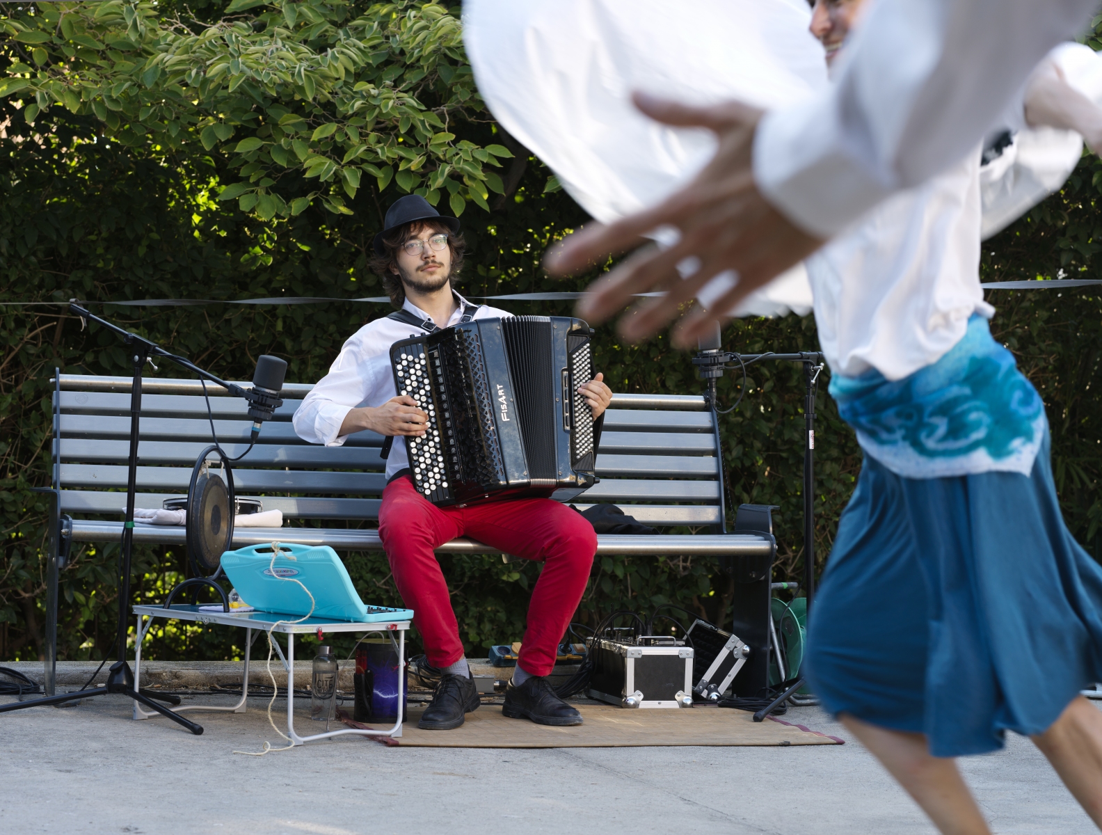 L’accordéoniste est en bord de scène, comme un témoin attentif de ce qui se passe, faisant lien entre le public et les personnages. Une ritournelle accompagne les scènes de pliage, mais celle-ci est malmenée au gré des ratés et des disgressions des personnages. Dans de grandes échappées, la musique emprunte à la valse, au tango, à la musique d’Europe de l’Est. Et pour certaines scènes, elle s’efface au profit d’ambiances sonores, tantôt aériennes, mystérieuses voire horrifiques.